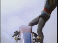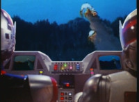 The VR Nitrocycle lowers its wings, then flies forth through its hangar tunnel. The VR Nitrocycle flies down from the VR Shoulder Cannon Shuttle. |