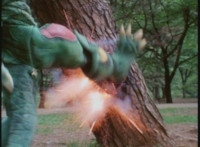 Charmador slaps hands, then leaps up. VR Ryan follows suit, both clashing in midair and bouncing back from one another. VR Ryan hits a tree and falls down, but quickly recovers when Charmador rushes at him, bounding off a tree as Charmador sparkily strikes it. VR Ryan rolls, then dodges as Charmador sparkily kicks another tree. VR Ryan pulls out his Laser Pistol and fires on Charmador, bursting him, but the beam is deflected back, also bursting VR Ryan. Undeterred, VR Ryan fires back again, bursting the mutant once more. |