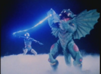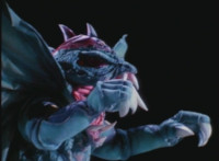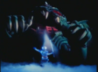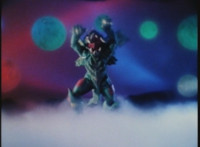 Karl Ziktor morphs into Grimlord, teleporting up to his Dark Fortress above, which floats through the virtual dimension. |