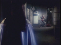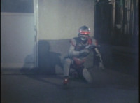 Close-up on Knighttime opening his mouth before spewing pinkish energy at VR JB, spark bursting him into falling over. VR JB recovers, but finds Knighttime is nowhere to be found, so he rushes off into a courtyard outside, and stops there. |