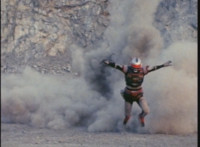 VR JB rushes at Bazookabot, ducks and rolls when he fires at him, an explosion erupting behind as VR JB throws a kick upon getting back up. |