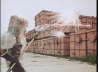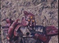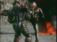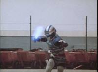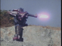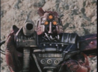 Bazookabot, his shoulder bazooka limp and smoking, spins around and tries to be intimidating, but VR JB just twirls his extended laser saber around and slashes him across the chest, which crackles as he agonizes. |