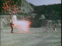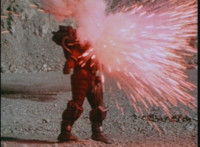 Bazookabot is energy slashed as he crackles more, then collapses backward, before exploding massively. VR JB remains posed until then, before turning around and facing us, all this in dramatic slow motion. |