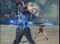 VR JB nod-talks quickly, then twirls his Laser Lance about, slicing upward diagonal, then downward diagonal. |