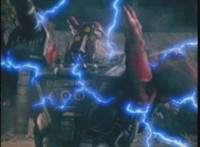 VR JB motions his arms about while his body trails, until he erupts into sparkle particles that reassemble as a giant energy image of him using the VR Techno Bazooka, firing both cannons forth. |