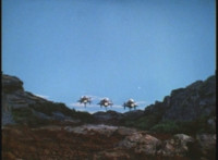 Three Grimstars fly through some clouds, then curl back around our way. |