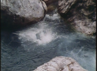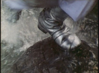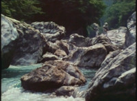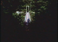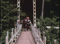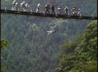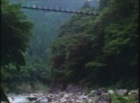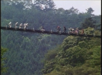 Pan up from the river below, to the rope bridge above as someone is walking across. |