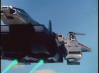 The VR Skybase passes to our slight left while firing a pair of green beams down. |