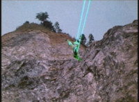Ryan plummets through the air, as a pair of green beams strike him. |