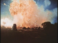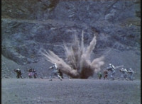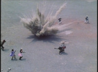 Explosions erupt in a wide field, flaming projectiles raining down upon it. |