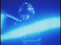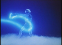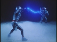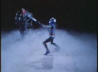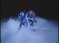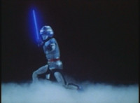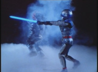 Fogbot readies his sword, rushing forth and fighting VR Ryan's energized laser saber, as he blocks each blow, and finally causes Fogbot to flip over. VR Ryan sparkily slashes Fogbot on the back. Fogbot gets up and activates the sparkler in his sword, spraying sparks at VR Ryan, until he converts his laser saber into a laser whip, flinging it at Fogbot, snagging his sword, and yanking it away. VR Ryan returns his whip to laser saber form, then rushes in and sparkily slashes Fogbot a few times, including on the back again, before explosively jabbing him, then releasing. |