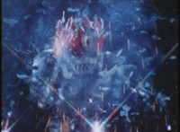 A blue, massive explosion fireball expands before us, rapidly flashing. VR Ryan turns around and poses with his saber as the strange dimension reverts to the blue skies of reality. |