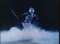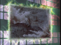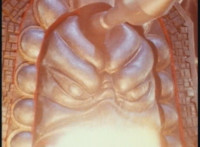 Puppetoid springs forth, VR Ryan turning around to see just as he bounds past him slashing, sending VR Ryan careening off into the dimension vortex, ending up in the Fractal Zone. There, as soon as he recovers to his feet, VR Ryan is faced by Puppetoid's giant head, spraying steam down at him. VR Ryan slashes at it to no avail, struggling against the spray until he's knocked off his feet. VR Ryan quickly gets up in a crouch, firing his Laser Pistol up into Puppetoid's maw, bursting brightly. |