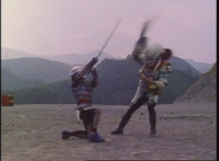 VR Ryan ducks and rolls under Puppetoid's slash, then clashes blades with him, striking his shield next, before locking blades for a moment, then flipping him down. Puppetoid recovers, just as VR Ryan corkscrew kicks into him, but gets blocked by his shield, sending VR Ryan spinning across the quarry, onto a cliff. |