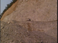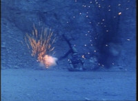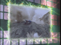 Puppetoid rolls into Indigo Sector, as VR Ryan approaches, firing lasers from his VR Nitrocycle, bursting around Puppetoid as he cartwheels past them. Gargantus fires, dirt bursting before VR Ryan's Nitrocycle, sending him flying from it, falling and rolling into the quarry. Gargantus fires straight on, and a massive fireball erupts behind VR Ryan, flinging him over, he falls, rolls, and recovers. |