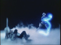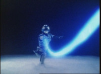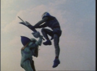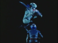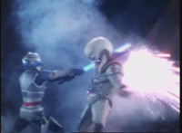 Puppetoid readies his own sword. VR Ryan converts his Saber into laser whip mode, using it to snag Puppetoid, then flip him over, before returning to Saber form. Puppetoid recovers in a rage, rushing at VR Ryan, who sparkily slashes him when he gets close enough, then sparkily stabs him once more, which he agonizes over. |