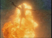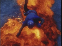 VR Ryan swimmingly flies away from a reddish-orange fireball. |