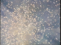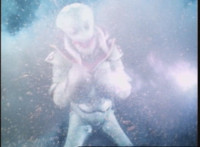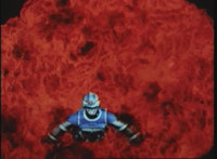 A blue, massive explosion fireball expands before us, rapidly flashing. VR Ryan turns around and poses with his saber as the strange dimension reverts to the blue skies of reality. |