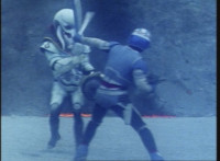 Puppetoid flies through the air, clashing sabers with VR Ryan in midair. |