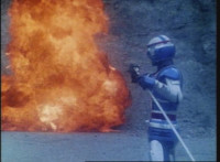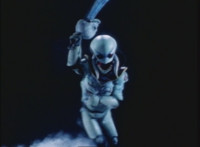 VR Ryan scans the area, finding Puppetoid is visible, and where. VR Ryan then aims his Laser Pistol at the right spot, targeting Puppetoid, firing at him and exploding behind him so greatly he's thrown into the air. |