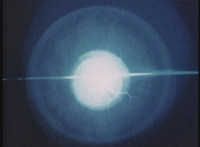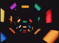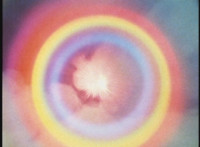 Repeated sharp zoom into a flare in the air as rainbow rings circle it. |