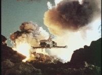 The VR Shoulder Cannon Shuttle flies low to the ground past explosions. |