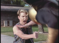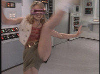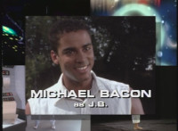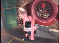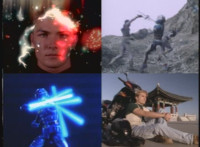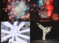 Clockwise from upper left: VR JB prepares to use the VR Techno Bazooka; JB's VR transformation sequence; JB does a karate kick in a computer simulation; JB powers down in the VR Lab; then center shot is JB smiling while talking. |