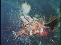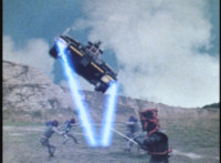 Sparkles burst upon the VR Shoulder Cannon Shuttle as Grimstars begin to fly in behind it. |