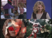 Clockwise from upper left: Kaitlin fights an Ultra-Skug in the Underground Voice newsroom; Kaitlin models; VR Kaitlins 1 & 2 fight some Skugs; Kaitlin's VR transformation sequence; then center shot is VR Kaitlin happily taking a picture in the park. |
