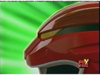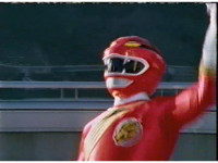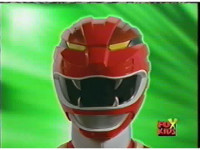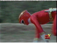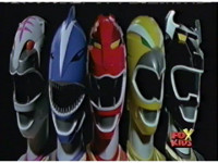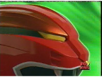 Against a green background, Red Lion roars, as Red Ranger's helmeted head cuts in from various angles. |