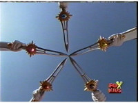 The five Rangers point their Crystal Sabers in a circle as they glow and gleam. |