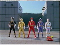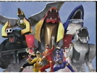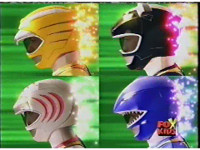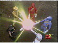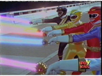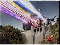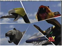 The five Rangers fire their Crystal Sabers, as the Wildzord spew energy. |