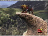 Red Lion leaps forth off of the edge of a cliff. |