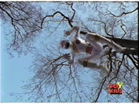 White drops down from a tree onto the camera, scratching her claws. |