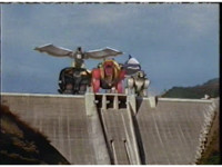 Atop the dam, the five Wildzords and five Rangers fire beams forth. |