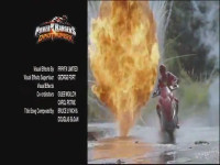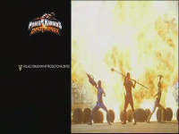 The three DinoThunder Rangers pose with their weapons in front of an explosion. |