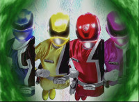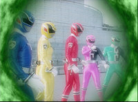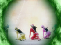 Blue, Yellow, Red, and Pink SPD Rangers finish morphing. |