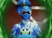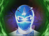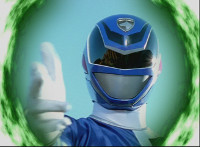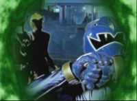 Blue SPD Ranger aims a fingergun at the camera. |