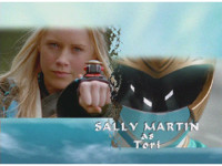 Split screen of Tori punching forth before morphing, while the right shows Tori's morph as her helmet closes. |