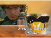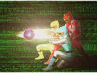 The earth symbol morphs into the silhouette of a Ranger posing in front of a yellow Shoji screen. |