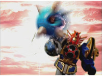 Storm Megazord finishes performing its finisher attack. |