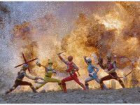 The five Ninja Storm Rangers pose in front of colored smoke, which turns into an explosion. |