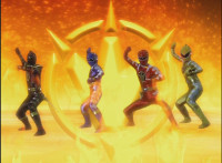 Left shot is a composite of US posing footage (from the morphing sequence) with unrelated Aba background; right shot is deleted footage; Black Tyrannozord tail smashes into a lightning bolt between the two shots, causing the whole screen to fly apart as a transition to the next shot. |