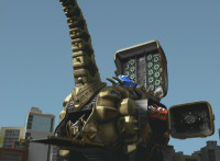 Tyrannozord walks in, roaring and firing beams from his mouth and tail, as the Power Rangers logo appears below him, followed by DinoThunder when he jabs his tail downward between the Power and Rangers turning it into a lightning bolt symbol. He roars again and the logo flies apart at us. |