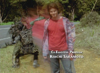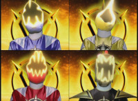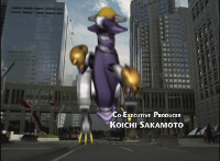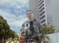 Left shot is a composite of US posing footage (from the morphing sequence) with unrelated Aba background; right shot is deleted footage; Black Tyrannozord tail smashes into a lightning bolt between the two shots, causing the whole screen to fly apart as a transition to the next shot. |