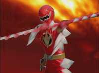 Red on his Raptor Rider twirls his Tyranno Staff around and slashes at the camera. |