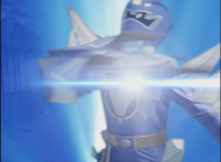 Left shot is from his morphing sequence; right shot is deleted footage; White Tyrannozord tail smashes into a lightning bolt between the two shots, causing the whole screen to fly apart as a transition to the next shot. |