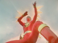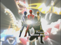 Left shot is a composite of US posing footage (from the morphing sequence) with unrelated Aba background; Red Tyrannozord tail smashes into a lightning bolt between the two shots, causing the whole screen to fly apart as a transition to the next shot. |