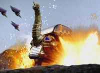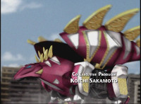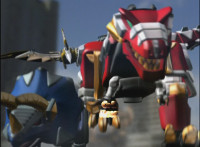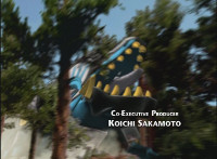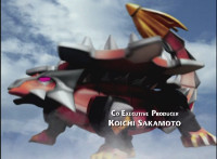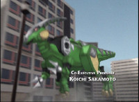 Tyrannozord walks in, roaring and firing beams from his mouth and tail, as the Power Rangers logo appears below him, followed by DinoThunder when he jabs his tail downward between the Power and Rangers turning it into a lightning bolt symbol. He roars again and the logo flies apart at us. |