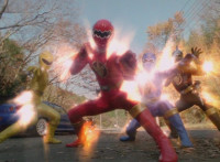 The four Rangers cease glowing amid energy flames as they step into a pose in front of a blue car. |